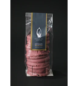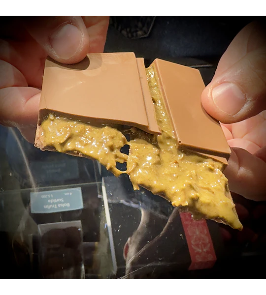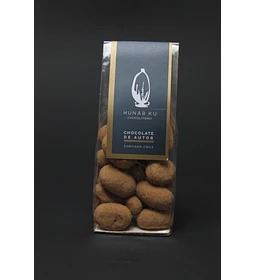 Alfajor de Chocolate de leche 36% cacao, Relleno con pasta de chocolate blanco y maní.