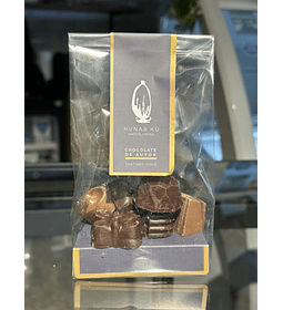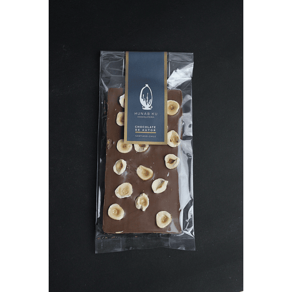 Barra de Chocolate de leche 35% cacao, con trozos de avellana europea. contenido: 90 g.